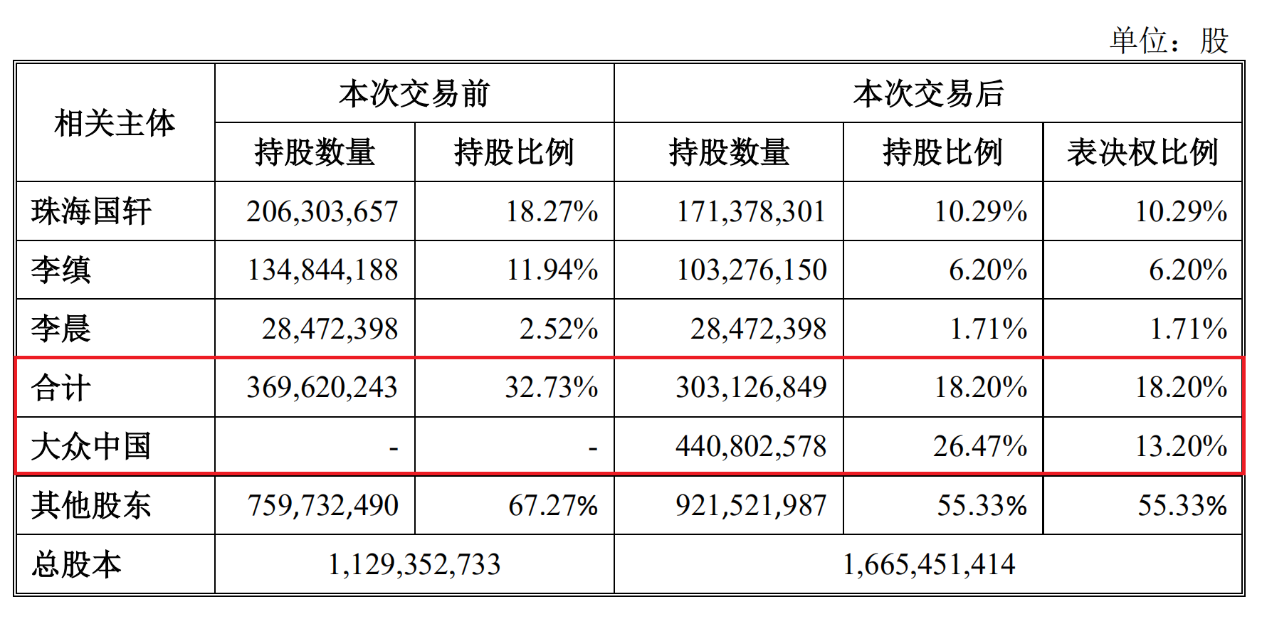 这是因为根据《股东协议》的安排,大众中国承诺自上述发行、转让的股份登记至其名下36个月(或其自行决定更长时间)起,将不可撤销地放弃其持有的部分公司股份表决权,使其表决权比创始股东方(珠海国轩、李缜及其一致行动人李晨)的表决权比例低至少5%以上。